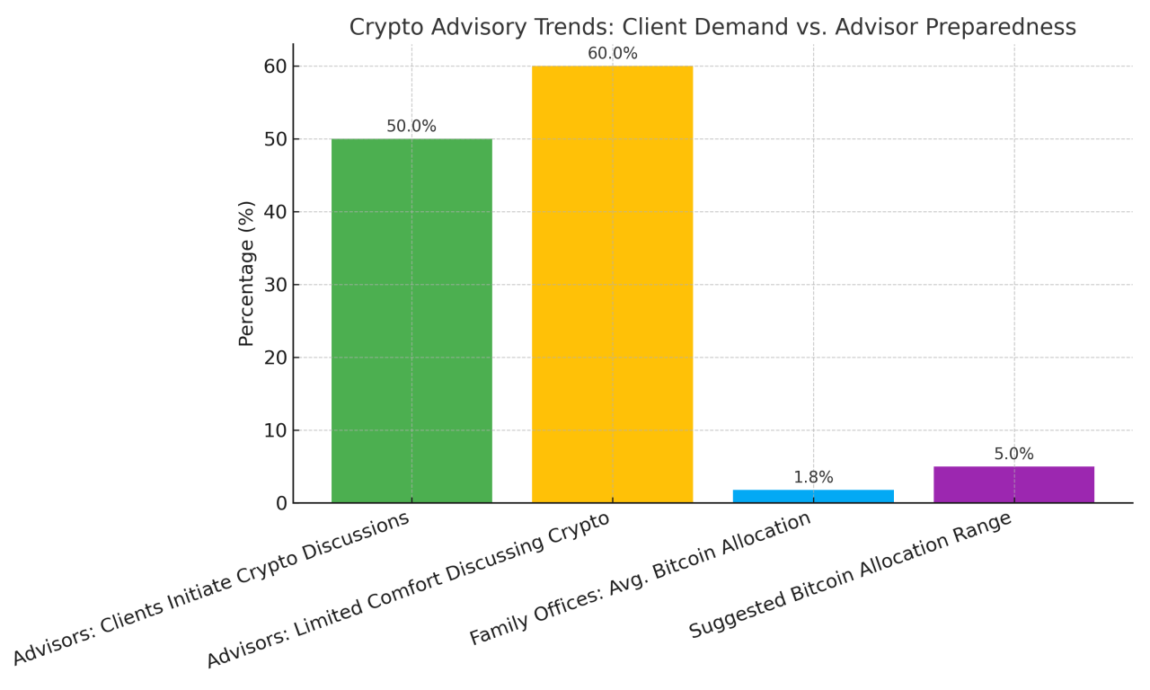 Client demand is fueling change: nearly half of advisors say clients initiate crypto discussions, yet most admit limited comfort addressing them. Institutional gatekeepers like family offices are increasingly adding Bitcoin, with average allocations around 1.8% and suggestions that 2–5% is reasonable.