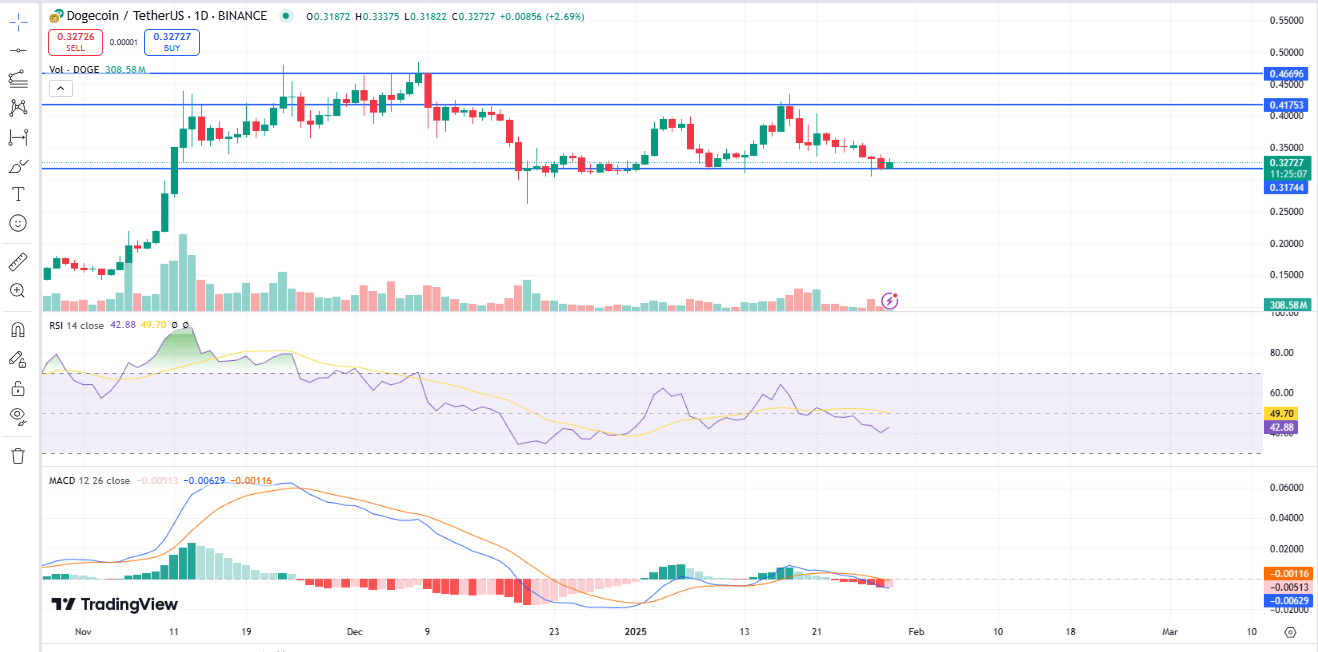 Early morning trading on Wednesday, Jan. 29, confirmed the bearish bias towards DOGE when its intraday trading price tested the critical $0.31 support level. The dispiriting start of the day was the culmination of a week-long downtrend that saw Dogecoin’s price slip by more than 10%, according to data from CoinMarketCap.