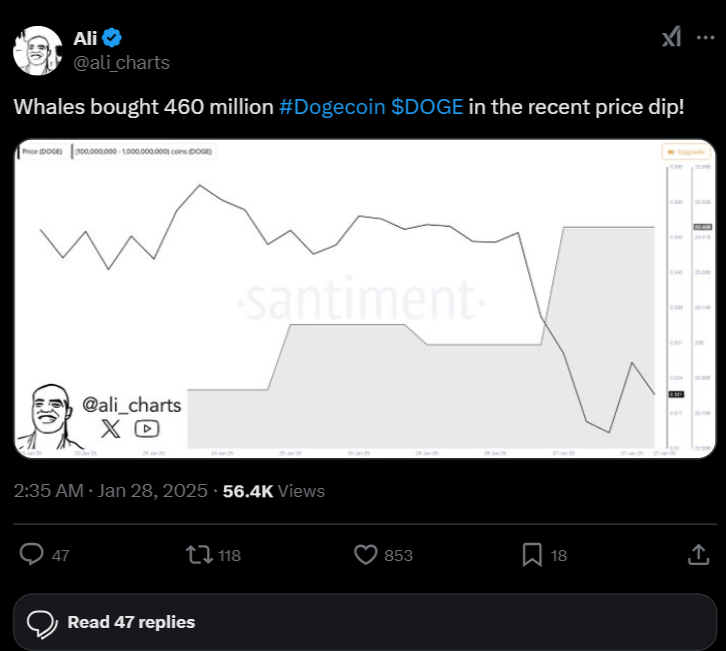 Compelling data shared by a top crypto analyst, Ali Martinez, shows that these large holders have bought more than 460 million DOGE over the last few days.