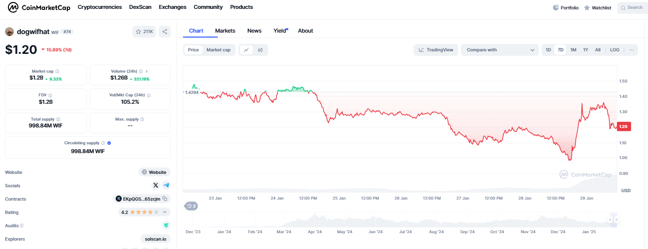 After a weeklong losing streak, Dogwifhat’s price flipped positive on Wednesday, Jan. 29, and rallied from $0.99 to $1.35, according to data from CoinMarketCap.