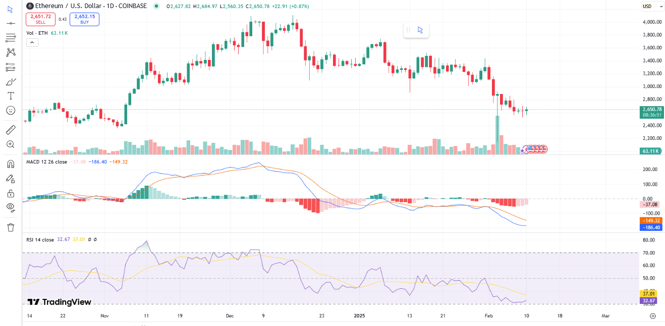 Ether trades around $2666 at the time of writing, having gained 1.43% in the last 24 hours. Its trading volume is, however, up by 45% to 21.38 Billion.