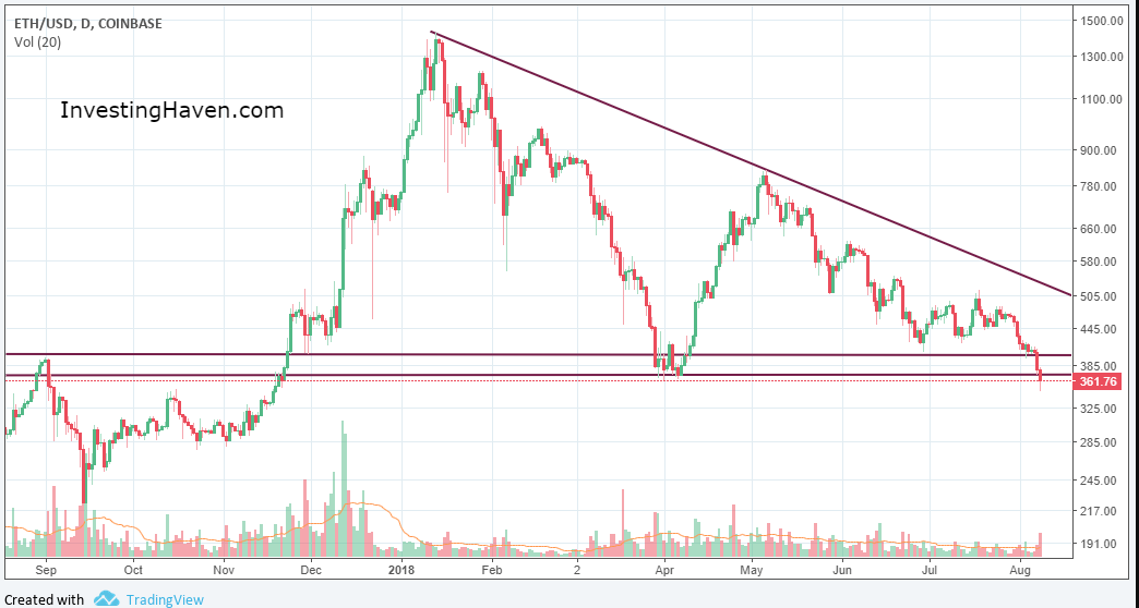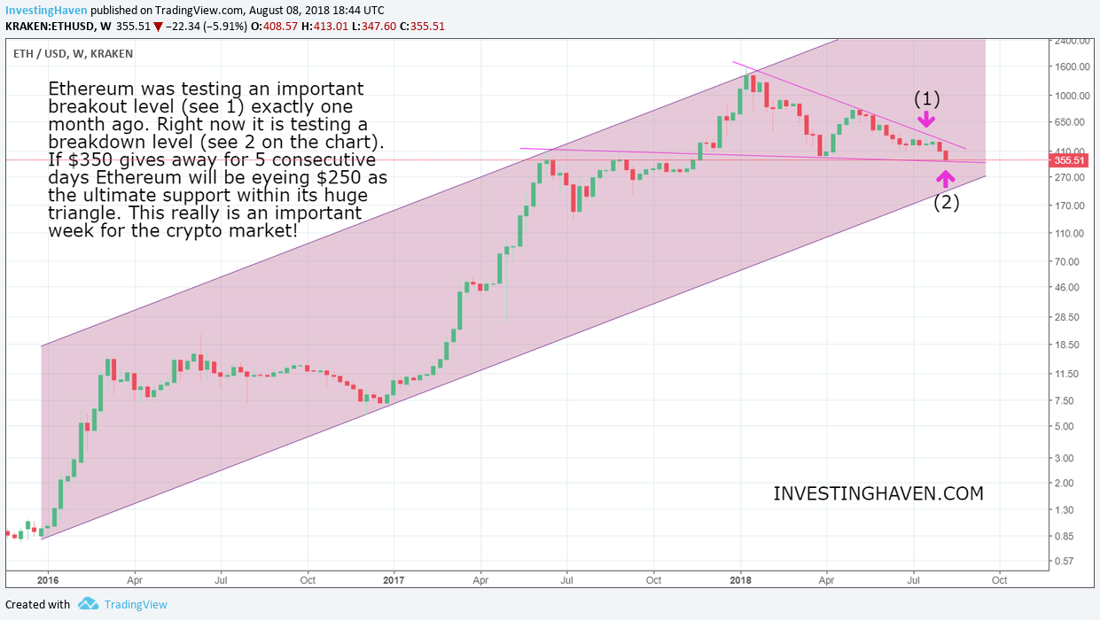 This massive triangle pattern after the top of January 2018 is still intact. As long as Ethereum trades above $350, and does not drop for 5 consecutive days below this level, there is no structural harm done.
