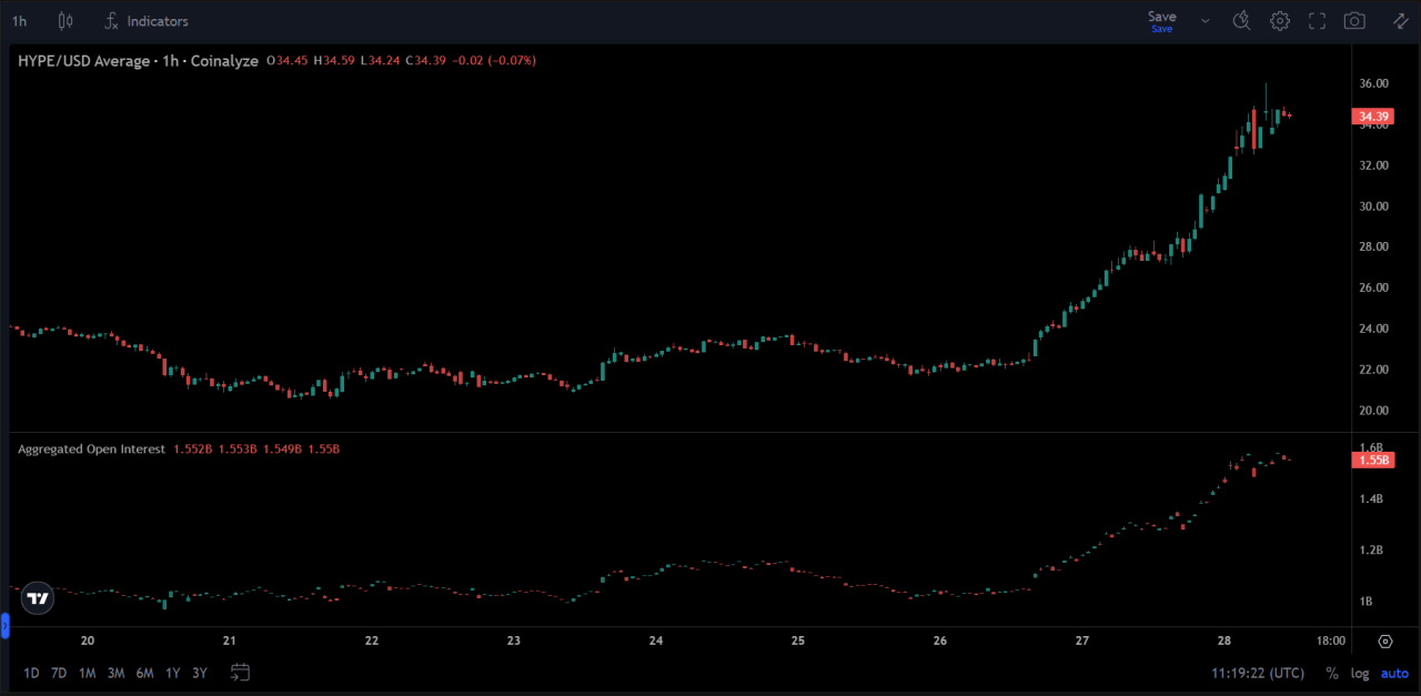 Over the past seven days, Hyperliquid saw sustained trading activity, with volume consistently elevated and open interest rising alongside price.