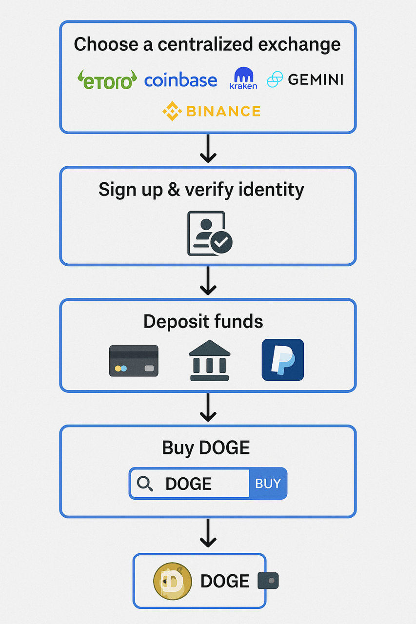 To buy Dogecoin, start by selecting a centralized exchange such as eToro, Coinbase, Kraken, Gemini or Binance. These platforms support DOGE purchases via credit/debit card, bank transfer or PayPal and are regularly recommended by financial outlets.