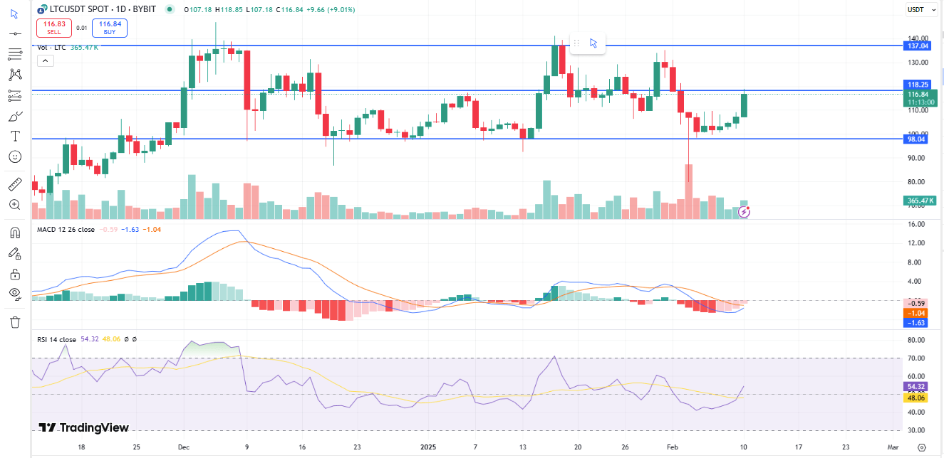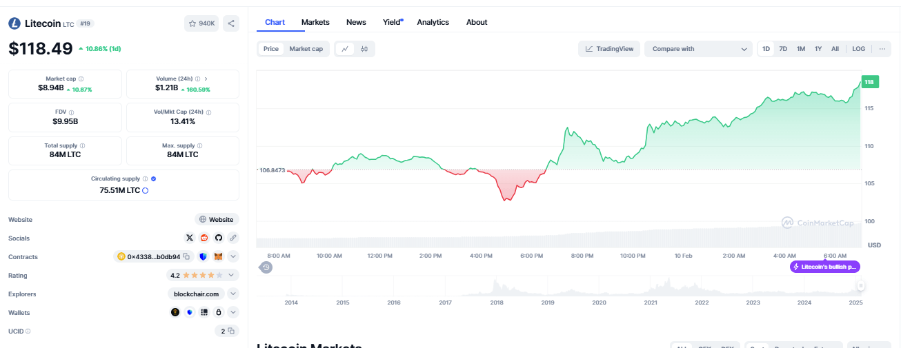 Litecoin’s daily trading volume grew by more than 160% in the last 24 hours to $1.12 Billion. The LTC price also shot up by more than 10% to hit an intraday trading high of $118 earlier today, Feb. 10.