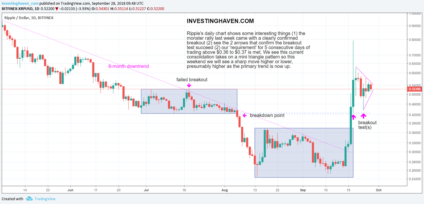 The daily price chart of Ripple makes our point, in particular the 2 arrows confirm that the breakout test succeeded. Note how the breakdown in the first week of August occurred at $0.42. With last week’s rally this gap was filled. More importantly, one day and 4 days after this monster rally the price of Ripple came back down and successfully tested $0.42. This confirms the breakout and the new bull market.