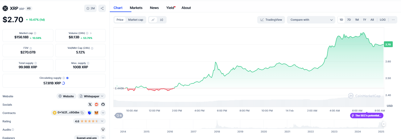 While the news triggered a trend reversal and an uptrend for DOGE, its biggest impact would be felt by Ripple investors as bulls pushed XRP prices up by more than 13% to hit an intra-day high of $2.78 in early morning Friday, Feb. 14.
