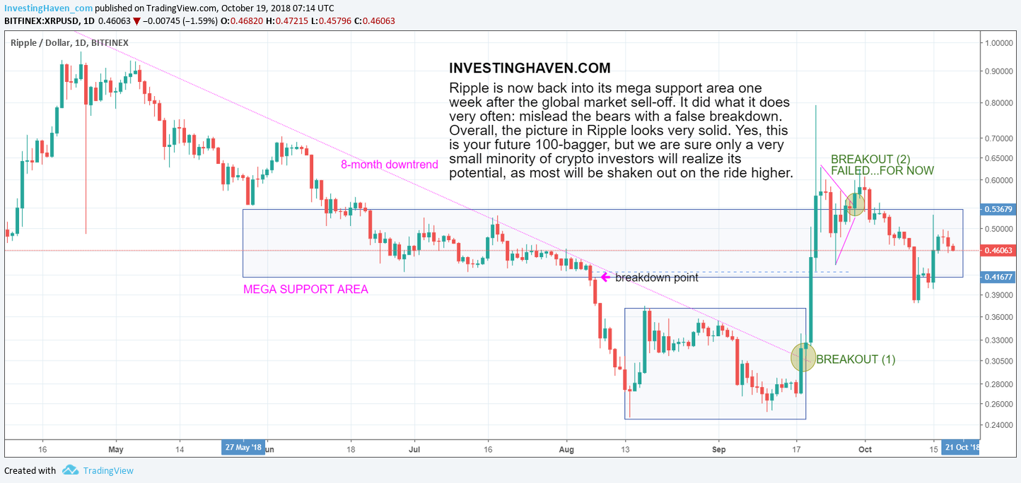 It may not feel this way but Ripple’s price chart really looks very solid. Obviously we are talking Ripple’s XRP token. Many crypto investors are concerned because Ripple did not continue its path higher after it broke out on September 20th, and its second breakout attempt stalled. However, we remain firm on our Ripple Price Forecast For 2019 with 100-bagger potential just because of the fact we fundamentally believe that Ripple Is The New Bitcoin, and, so far, the Ripple price chart does not signal the opposite.