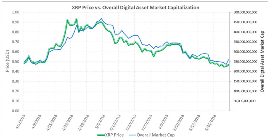 As per Ripple’s quarterly market report the price of XRP declined in a similar fashion and at a similar pace as the whole crypto market which can be seen on this chart.