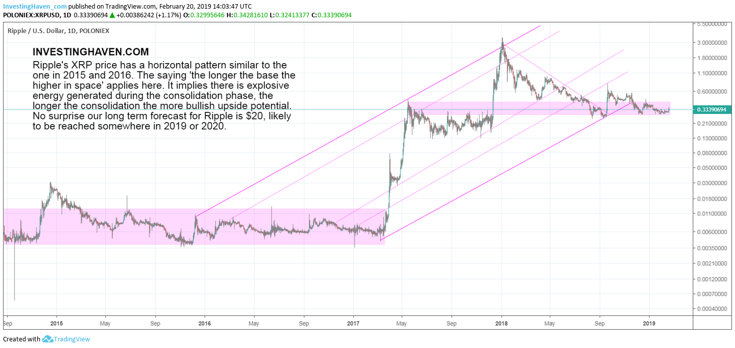 Ripple is our top favorite crypto company, that is not a secret. How high can the price of Ripple’s cryptocurrency, the XRP token, rise? In a discovery-like fashion we come to the answer in this Ripple forecast for 2019. In sum, we are convinced that the (XRP) token will move to $20. Our base case Ripple price forecast for 2019 is $20. We consider this our baseline Ripple forecast.