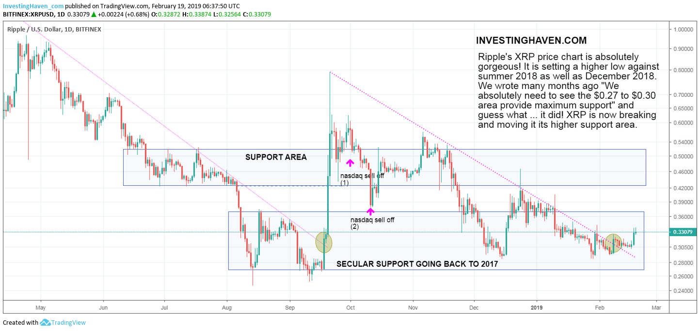 Ripple’s XRP (XRP) rose 10 pct in the last 3 to 4 days. It’s no coincidence that Bitcoin is moving higher as well. As always, InvestingHaven stays focused on the chart as per the principle ‘start with the chart’. There is one observation that really stands out, reviewing Ripple’s XRP chart: a higher low in 2019 compared to the lows in 2018. This is very, very bullish for the long term! There may be a long road to our XRP forecast as well as our call that XRP becomes the largest cryptocurrency, but it is these early bullish signals that make a difference and provide confirmation of our long term vision!