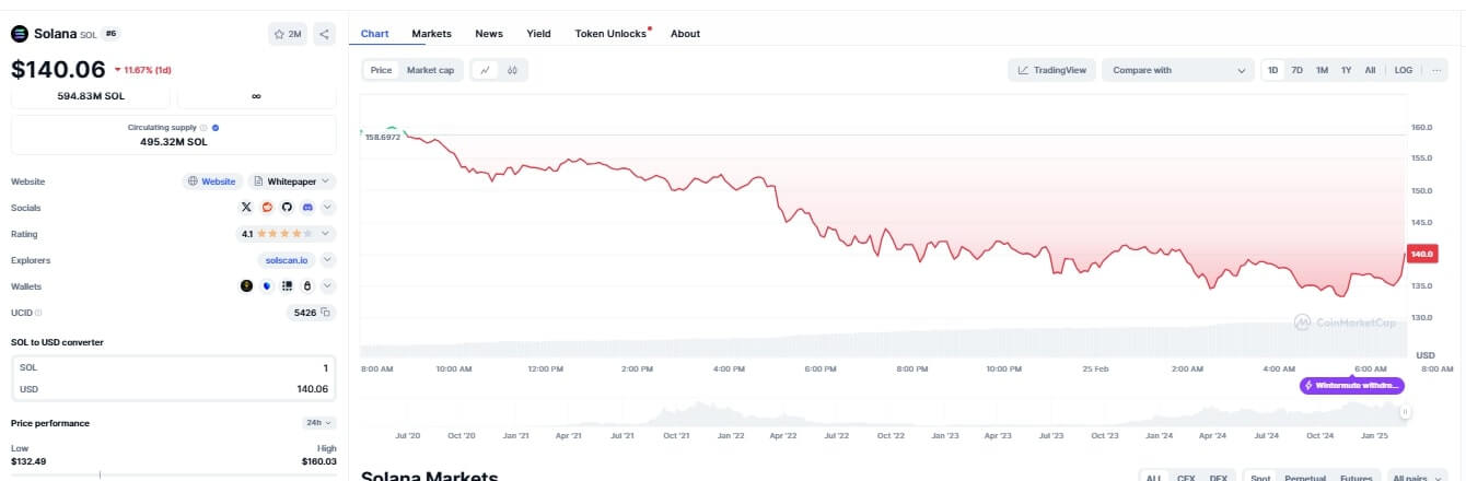 Of the top 10 most valuable assets, Solana stands most affected by the ongoing market downturn. SL prices crashed by more than 18% in the last 24 hours, from yesterday’s high of $160 to an intraday low of $132, a price level last September 2024.