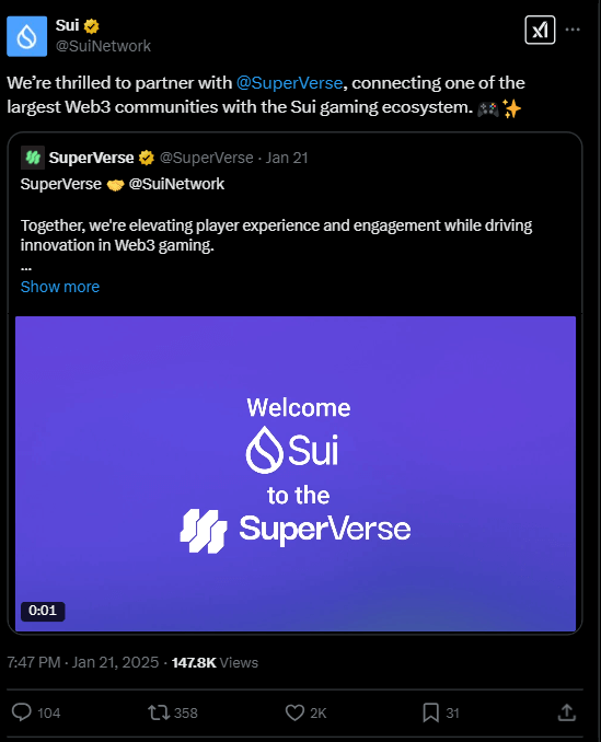 Secondly, SUI extended its footprint in the fast-growing GameFi industry when it partnered with Superverse, one of the largest Web3 Gaming communities.