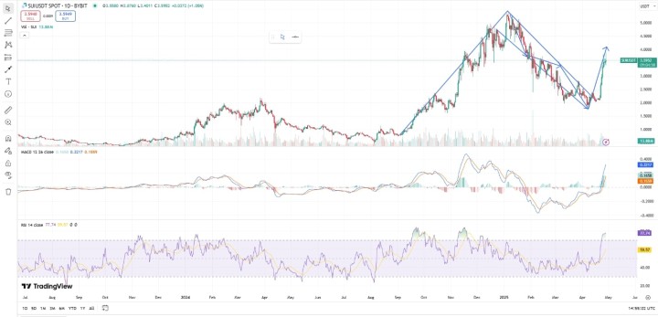 In fact, both technical indicators and developments on the SUI network, led by a sharp rise in TVL and a surge in DEX volumes, hint at a further uptrend – possibly to a new all-time high.