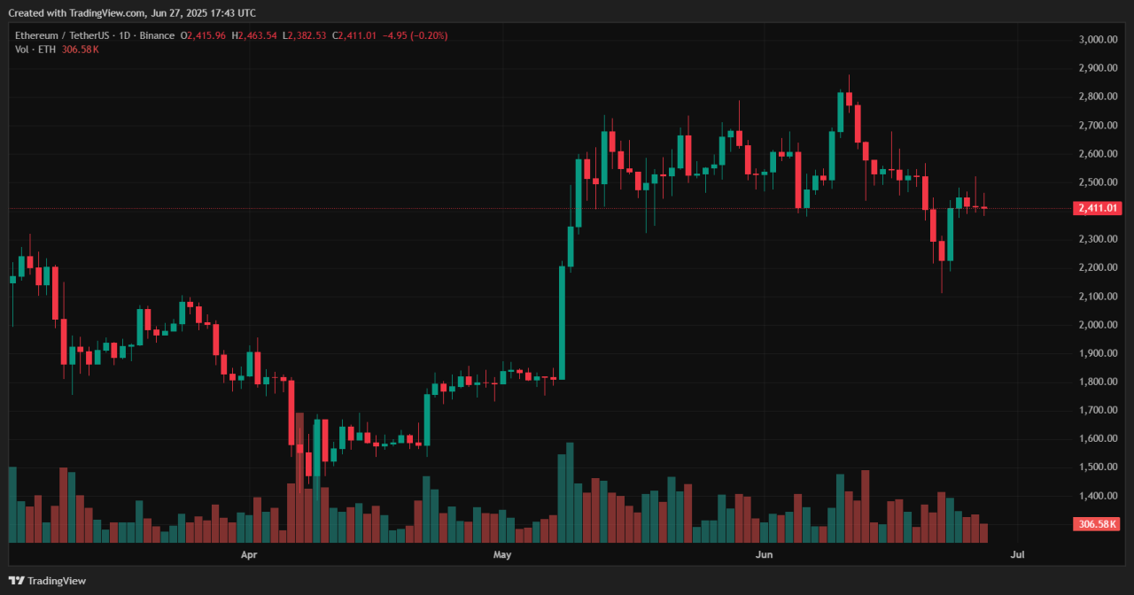 Ethereum has remained just above $2,400, supported by robust whale accumulation—over 871K ETH added in a single day recently, the highest since 2017.