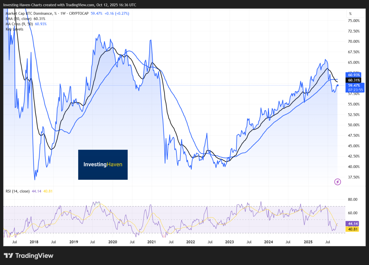 Bitcoin’s dominance has climbed to about 60%, showing that most new money is flowing into BTC rather than smaller coins.