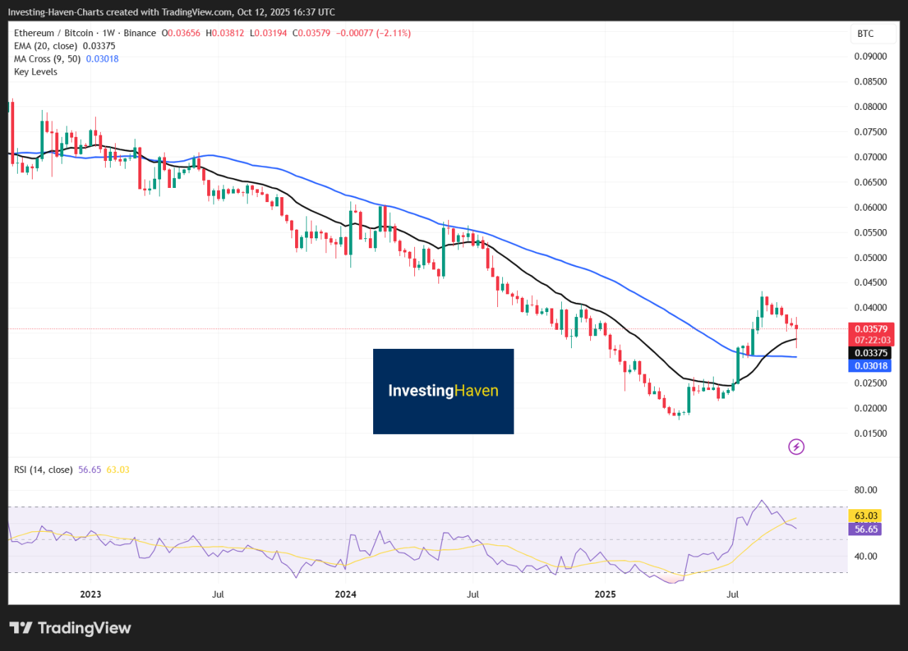 Ethereum shows mild strength, with the ETH/BTC ratio near 0.035, hinting at possible rotation.