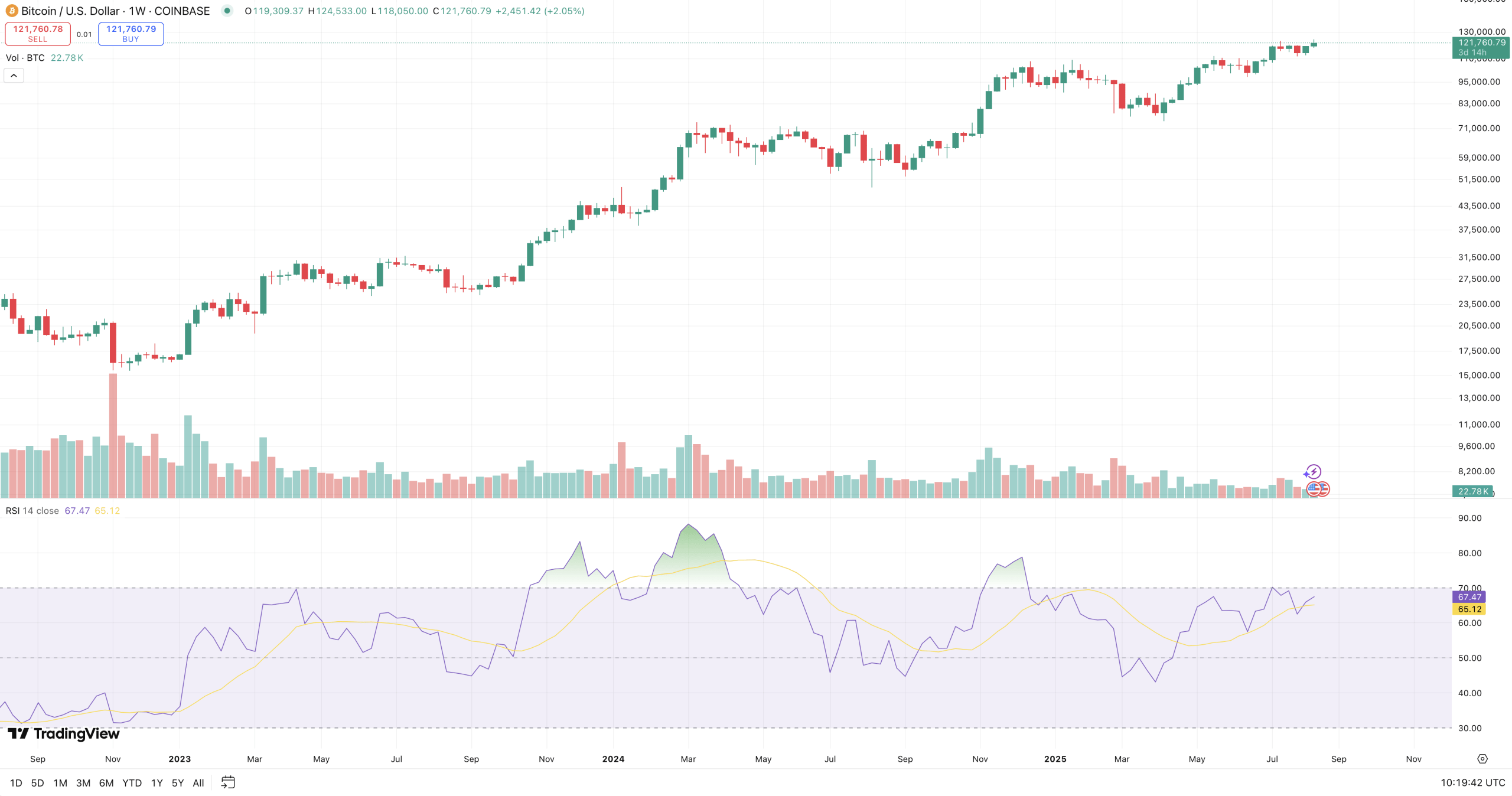The Bitcoin price has consolidated around the $121,678 level, giving it a 6% increase in a week and a 5% gain in a month.