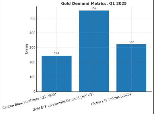 In Q1 2025, central banks added 244 tonnes of gold, while gold ETF investment demand more than doubled year-on-year to 552 tonnes. Global ETF inflows totaled about $30 billion so far in 2025, adding 322 tonnes to holdings.
