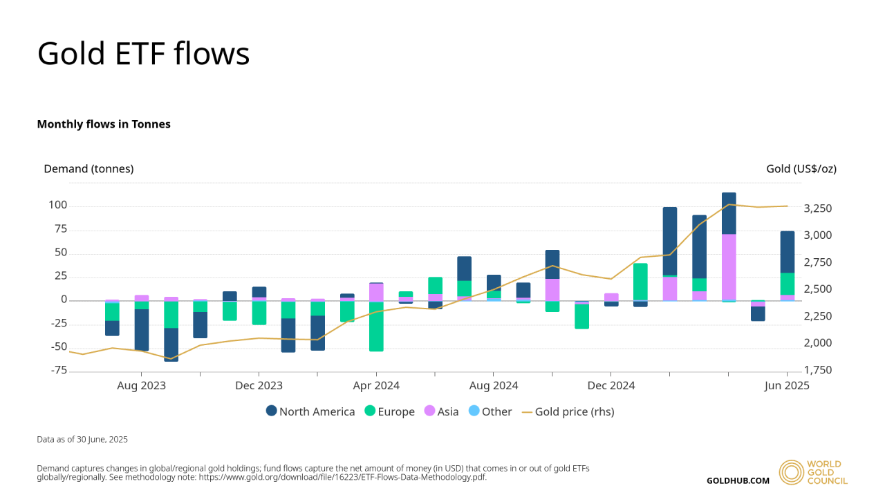 Central bank purchases and ETF demand account for the bulk of the accumulation. The World Gold Council shows global physically backed ETFs recorded US$38bn of inflows in H1, and total Q2 demand reached 1,249 tonnes, with demand value at US$132bn.