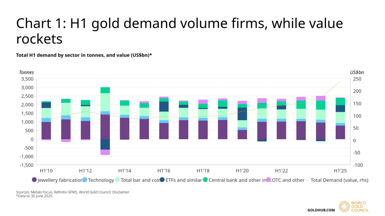Official purchases remove metal that would otherwise flow to traders or industry, tightening the physical market. Total global quarterly demand, including investment, reached 1,249 tonnes in Q2, a 3% increase year on year, showing how strong investment has become.