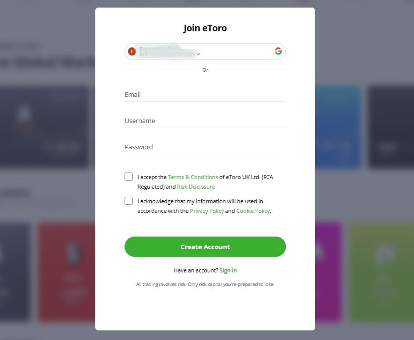 Start by opening the official eToro website or downloading the eToro mobile trading app. Click the “Join Now” icon on either platform to bring up the user registration form.