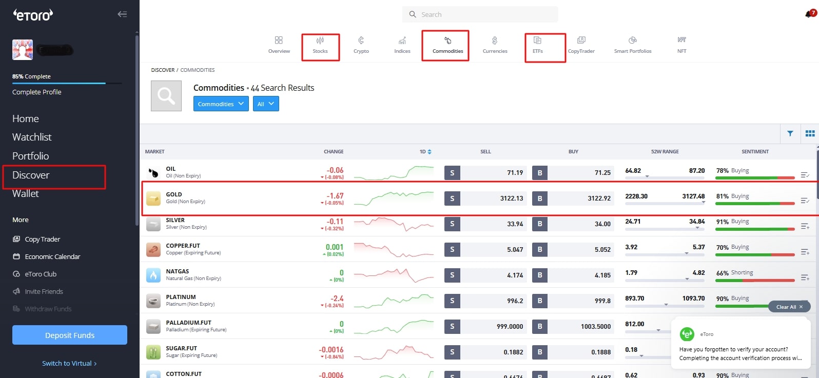 Still, on your user dashboard, click on the “Discover” icon. This will bring up the financial instruments available for trading on eToro. If you are looking to buy Gold ETFs, choose “ETFS” and choose the Gold ETF you wish to invest in from the list that appears.