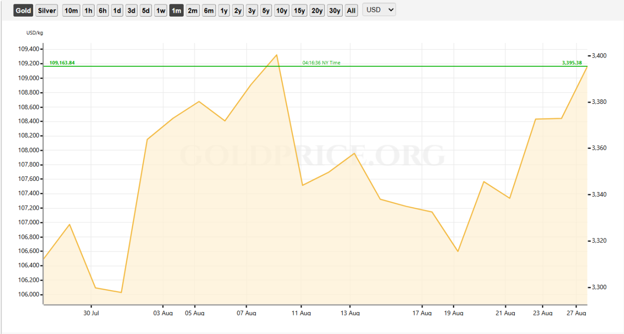 Spot gold has held steady near a two-week peak around $3,390 to $3,400, while futures trade in the mid-$3,440s, reflecting strong underlying demand despite short-term fluctuations.