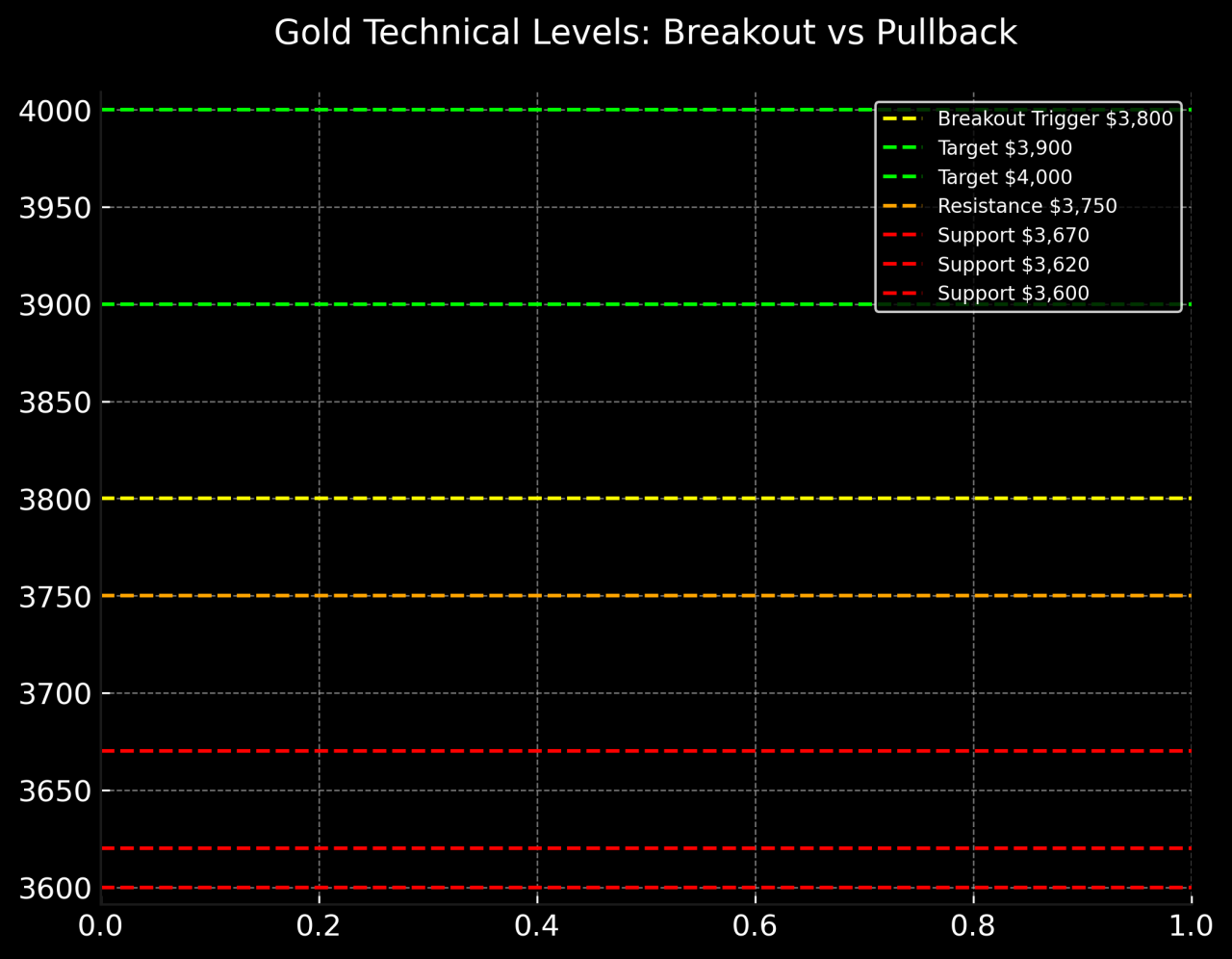 Based on our Gold technical analysis, the first barrier to clear is $3,750 to $3,800, a cluster of recent intraday highs and a psychological cap. If price holds above that band on a weekly close, traders treat that as a clean breakout.