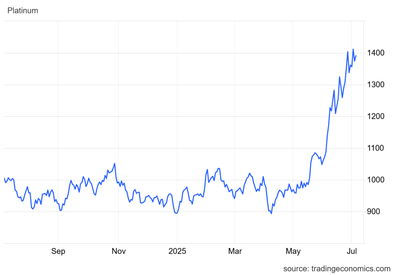 Platinum has been the quarter’s standout, rallying ~36–49% in Q2, peaking near $1,432/oz—an 11‑year high—propelled by Chinese demand and supply disruptions in South Africa.