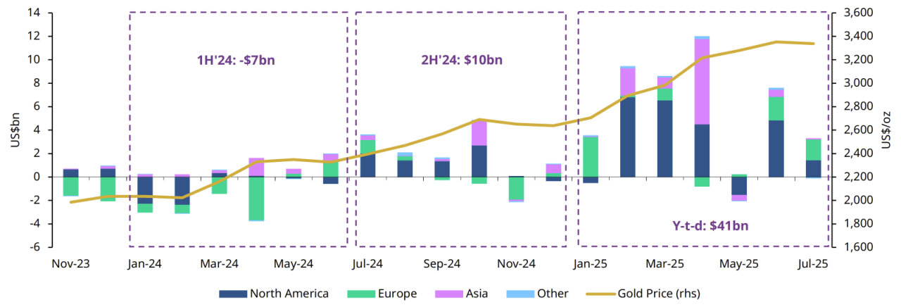 Global gold ETF holdings rose by 23 tonnes in July to 3,639 tonnes, while AUM reached a month-end high near $386 billion. UBS lifted its 2025 ETF demand estimate to 600 tonnes and now sees total gold demand rising about 3% to 4,760 tonnes, the strongest since 2011.