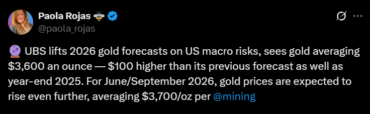 Gold has outperformed major assets in 2025, with year to date gains near 28%. UBS now projects $3,600 per ounce by March 2026 and $3,700 by June and September 2026.