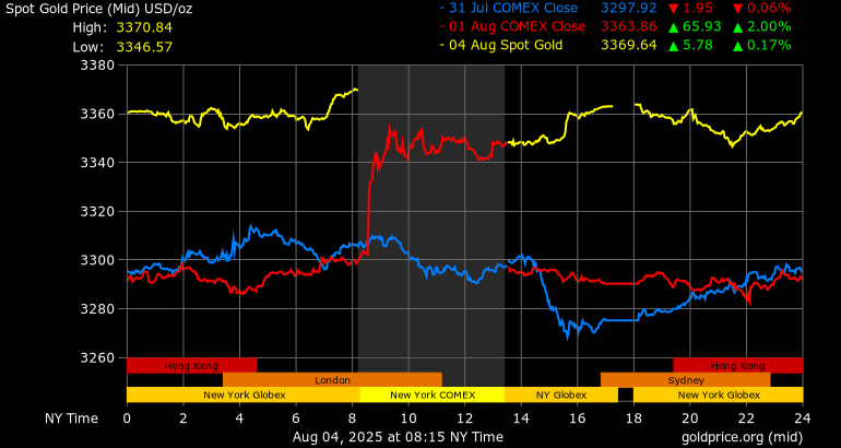 Spot gold sits at $3,369 per ounce after a roughly 1.8 percent gain last session on the U.S. jobs miss that showed just 73,000 new positions added in July. Traders now price in an 81 percent chance of a Fed rate cut in September.