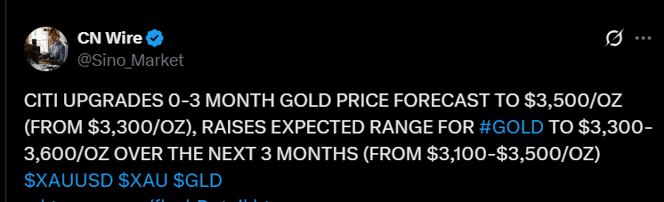 Citi just lifted its 3‑month gold price forecast to $3,500, expanding its expected trading band to $3,300–$3,600, citing worsening U.S. growth, tariffs, and a weak dollar.