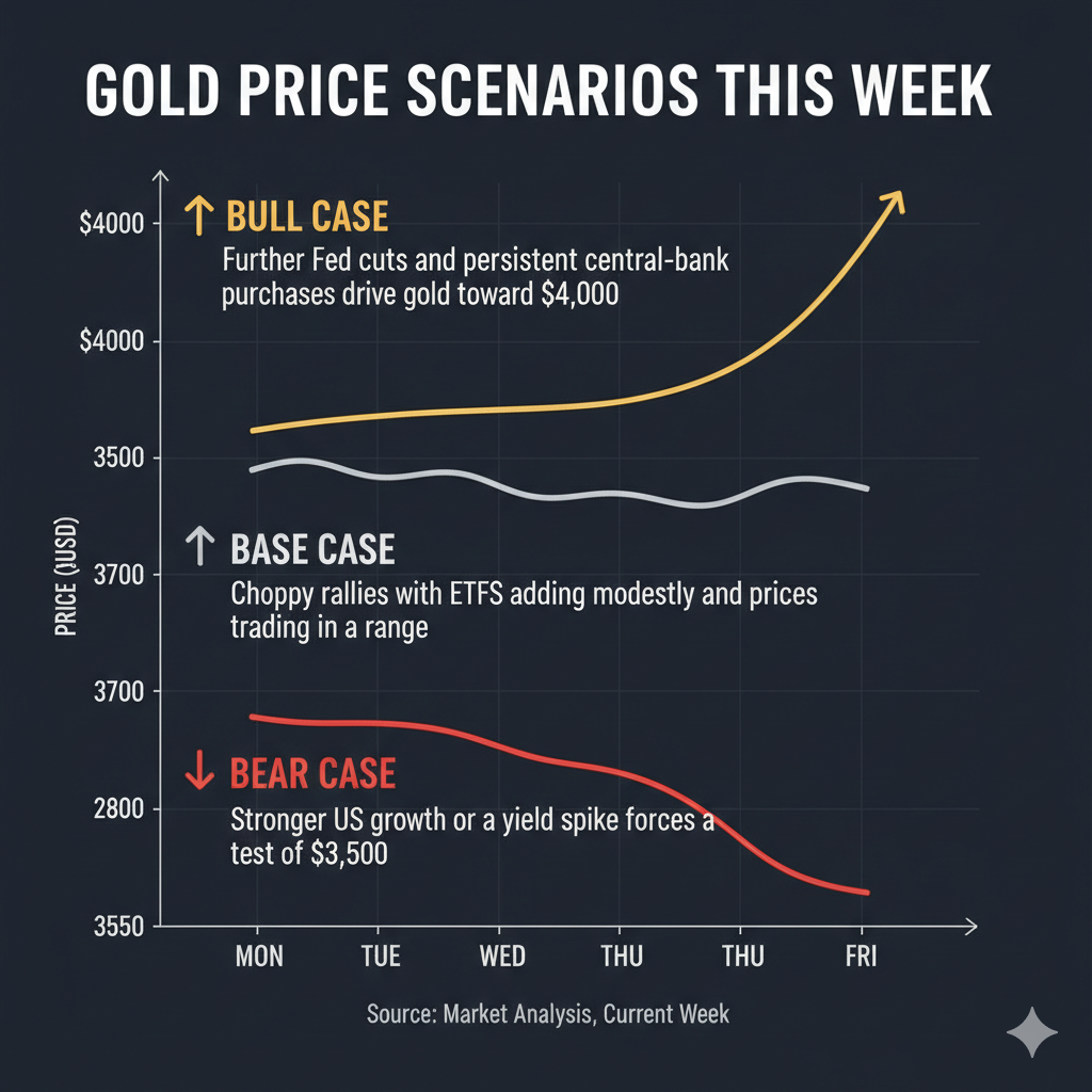 - Bull case: further Fed cuts and persistent central-bank purchases drive gold toward $4,000.