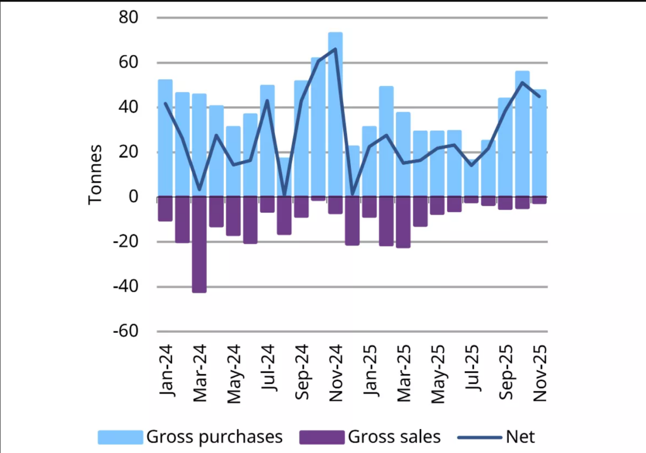 Central banks have become one of the most important forces in the gold market. In 2025, net official buying stayed well above historical norms, with several countries adding large volumes to their reserves.