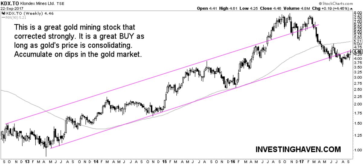 #2 Klondex Mines has a similar market cap as Richmont Mines. P/E is 85x, the EPS is lower at 0.04, short float ratio is 8%. These financials are maybe not great, but the stock got a hard hit recently and so it is back at the lower area of its rising channel. This stock is not as attractive as Richmont but still a great buy on dips.