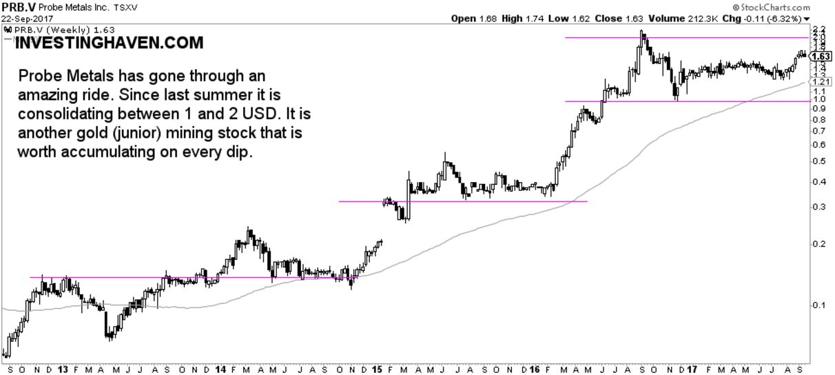 Though Probe Metals entered a longer term consolidation area it definitely is worth buying on any dip. The risk is higher than the other 2 gold miners because this stock is still in exploration phase.