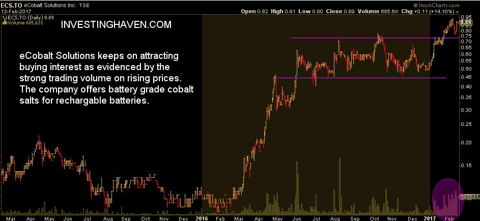 eCobalt Solutions, a very small cap resource stock with a market cap of less than $100M, provides battery grade cobalt salts which are used for rechargable batteries. The company’s stock price started rising last March, and became a ten-bagger two weeks ago. In the meanwhile, it went through a consolidation period around summer time. Right now, volume is on the rise again, and the stock looks very enticing provided that the steel sector keeps on rising.