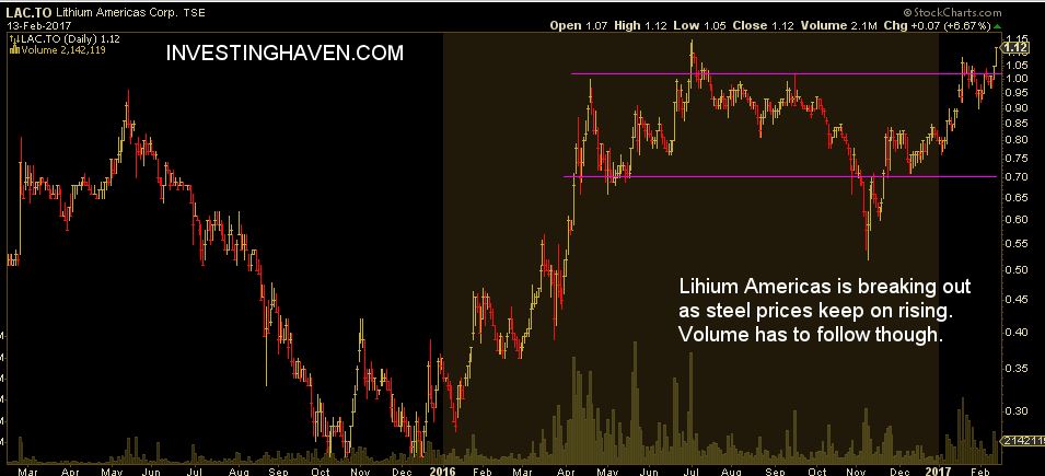 First of all, Lithium Americas, a $350M small cap resource stock, provides lithium for the new generation rechargable batteries. The stock rose sharply in the first months of last year, consolidated for 8 months, and is now breaking out again. Today’s rise of more than 6 percent, right at resistance, is telling.