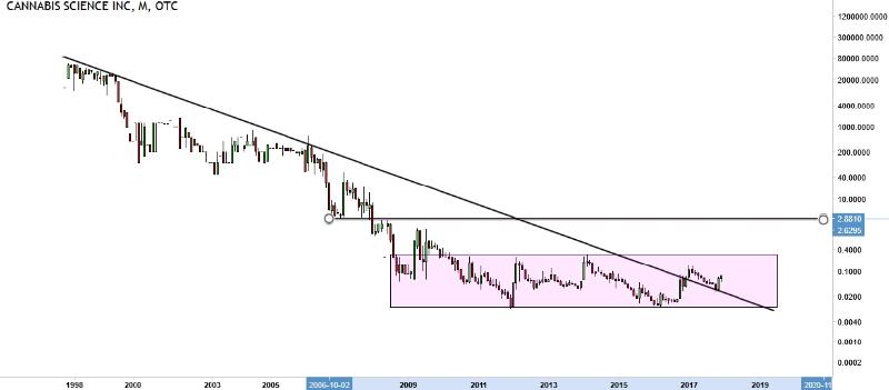 The monthly chart of Cannabis Science shows that its price has been consolidating since 2009. It broke the downtrend line in Jan 2017, retraced and tested the resistance after which it turned into support. At the time of writing, price was trading at 0.0838, our projected target for 2018 is 0.25 with an ultimate target of ~2.50 beyond 2018 should price break above 0.3. In case prices retrace further, the important support is ~0.665 followed by ~0.0425.