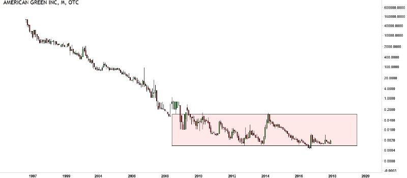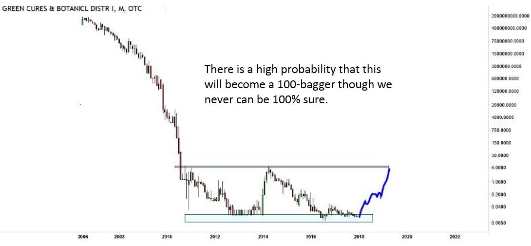 The monthly chart of GRCU shows a potential massive double bottom formation, and a projected W pattern. At the time of writing, price is trading at 0.0175. The first target is 0.06 by 2018, while the heavier resistance will be around 0.27 which is the target beyond 2018. Provided the business really matures, we are more interested in the far fetching target of ~5.4 (how long investor have to wait for this price target really depends on how price moves over the next 5 years). On the flipside, the worst case scenario could lead to total loss of initial capital.