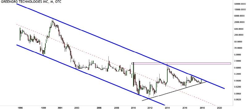 The monthly chart of Greenpro Technologies definitely reflects the coming legalization of the cannabis business next year. Since the top in Feb 2010, its stock price has been confined into a potential triangle and price is just attempting to break the downtrend resistance. If it successfully breaks up, the 2018 target will be ~0.155 and ultimately ~1.3 beyond 2018. Should the breakout fail, immediate support is ~0.0325 which will negate our bullishness on this stock.