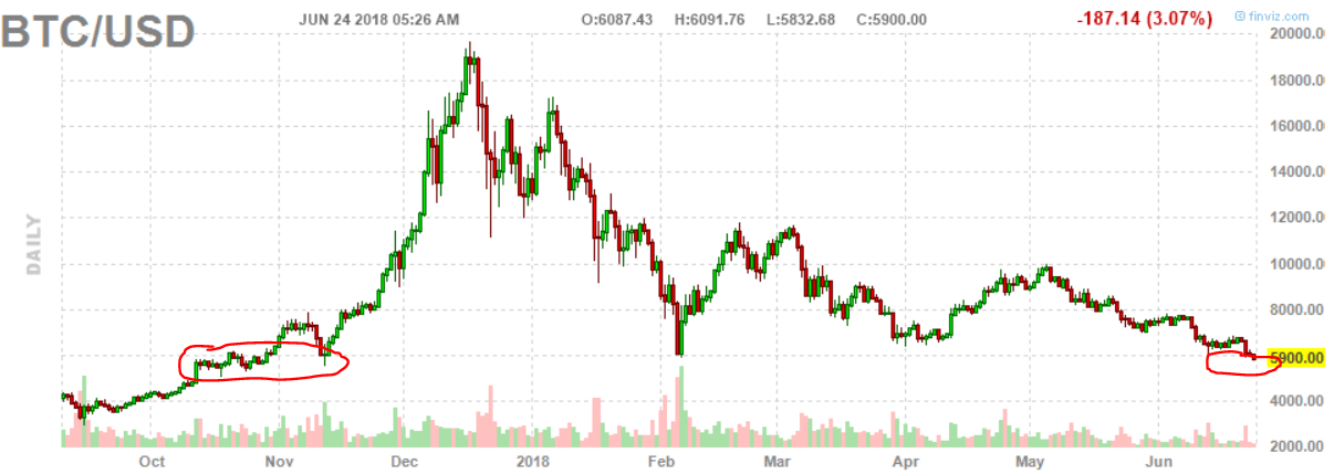Last night, the price of Bitcoin (BTC) broke below the important $6k level which we identified as a crucial level. What now?