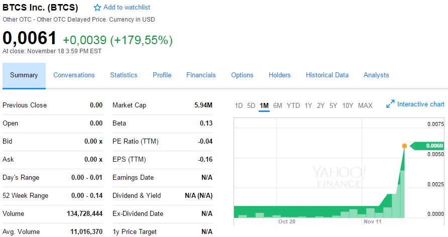 Next we look at Bitcoin Shop, a company with a market cap of only $5.9M. We see the same pattern of a very strong volume increase in the last couple of days, with an exponential rise of its share price.