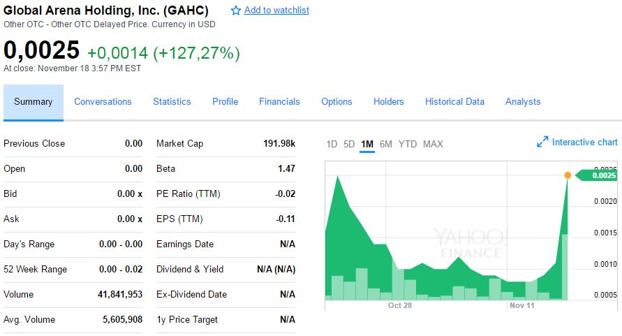 The first stock we look at is Global Arena Holding, a tiny stock with a market cap of only 191k at the moment of writing. The 1-month chart below shows how the strong volume increase on Friday November 18th.