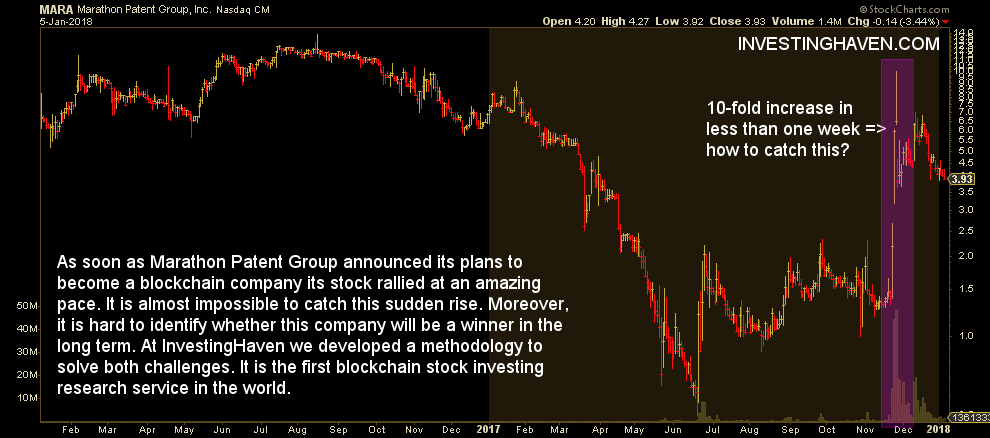 Let’s illustrate this with an example. Marathon Patent Group, a nano cap stock in 2017, with a steeply declining stock price, announced early December that it would become a blockchain company focusing on mining cryptocurrencies. In 3 days the stock price of this company went up 10-fold.