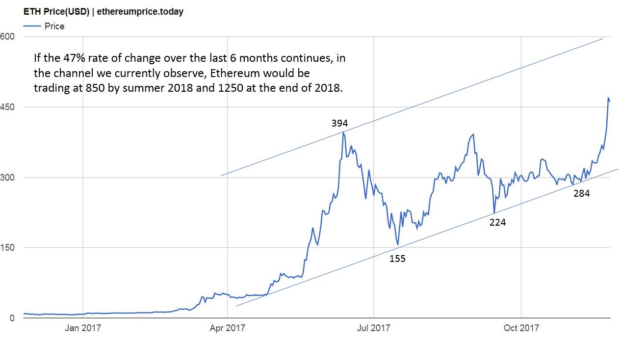 Earlier this week we wrote how the price of Ethereum engaged in a mega breakout right after it crossed the triple top price level of $400. That was for us the trigger which confirmed our long-standing price targets: target of 550 USD stil in 2017 and our longer term target of 1000 USD (before 2020). InvestingHaven’s research team noticed something very interesting after this week’s breakout: a trend channel that is developing on Ethereum’s price chart, and it resulted in a series of Ethereum price predictions.