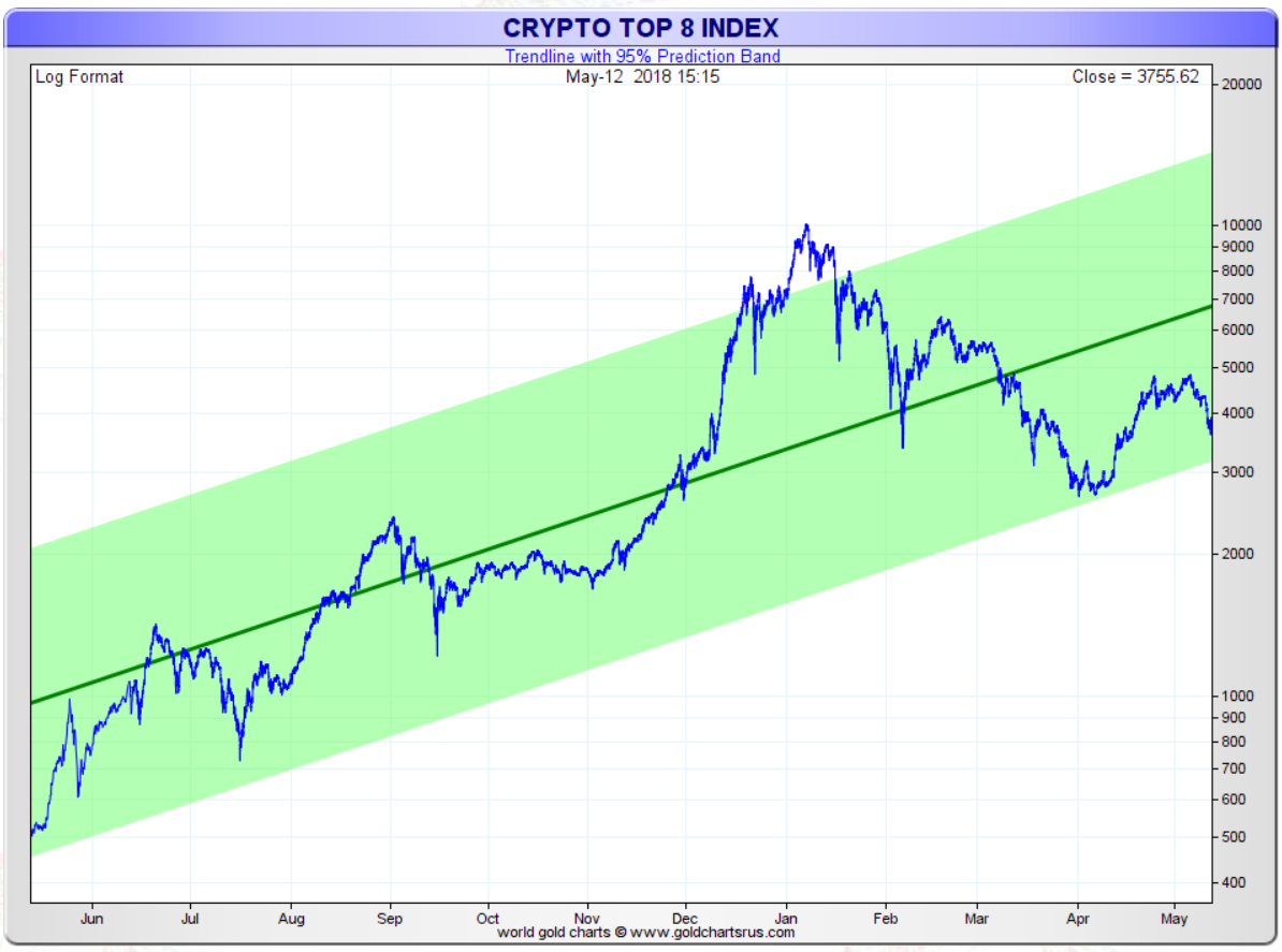 A couple of weeks ago we explained in this article why we believe cryptocurrencies are a BUY: Cryptocurrencies: A Must-See Chart Going Into May 2018. We said that the long term cryptocurrencies chart which incorporates the 8 largest cryptos reveals a couple of bullish things (chart courtesy GoldChartsRUs)