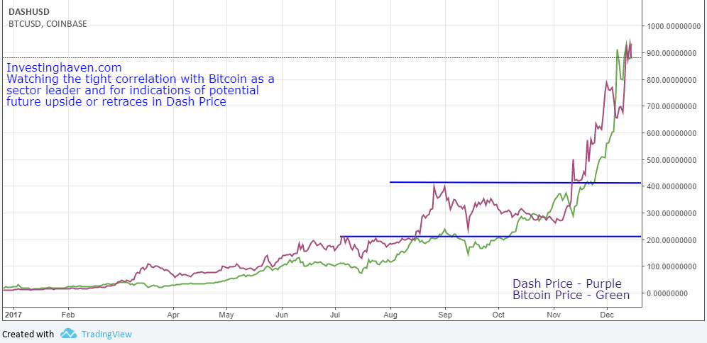 As we can see from the chart below, there is a tight positive correlation between Dash price movement and Bitcoin. Except from very few instances, they tend to move in tandem. If Bitcoin continues on its pattern of reaching new all-time high, slight correction then another all-time high, we expect Dash to follow upwards as well.